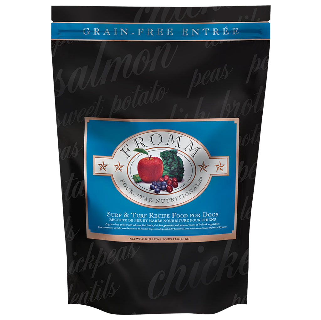 An entrée with salmon, fish broth, chicken, potatoes, and an assortment of fruits & vegetables