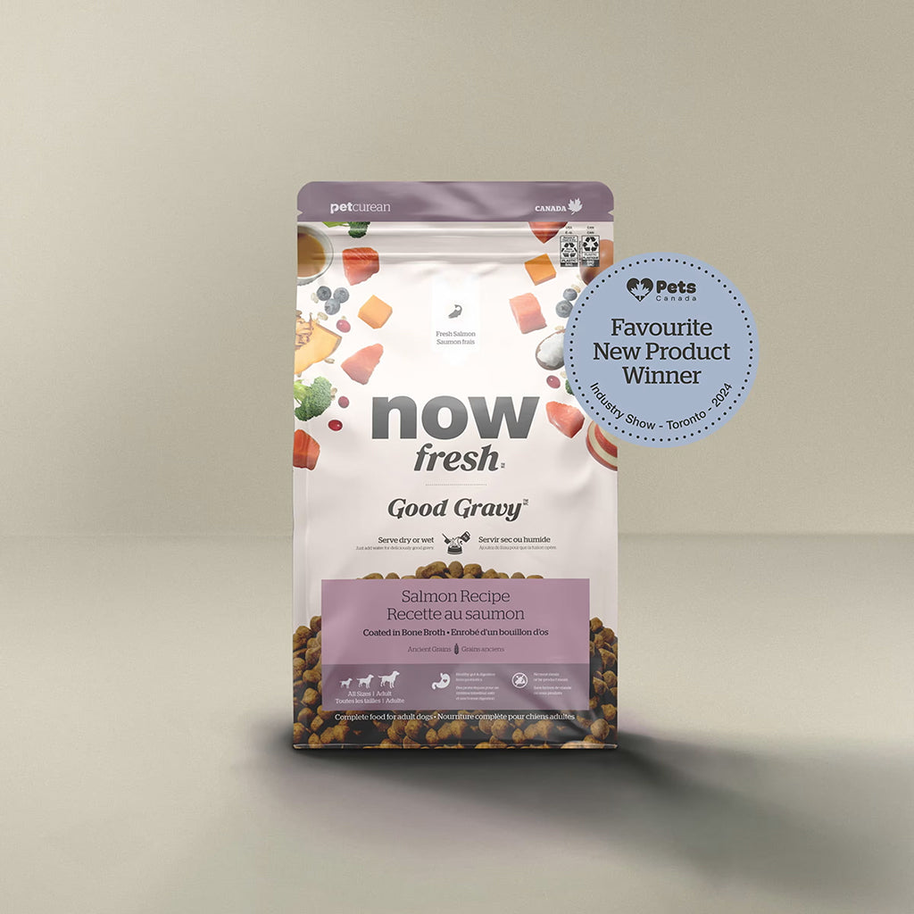 Get your dog doing the 'happy dance' with Good Gravy Salmon dog food, enriched with ancient grains and a bone broth coating. Easily feed dry or mix with water to create a delicious, hydrating gravy for dogs. Crafted for complete nutrition and yummy flavour, this recipe features fresh salmon for easily digested protein and omega-3s for skin and coat support, plus nutrient-rich fruits and veggies.